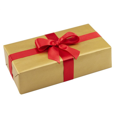 Ręczne pakowanie prezentu - złota wstążka, całość zapakowane w ozdobny czerwony papier
