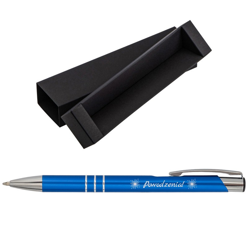 Długopis niebieski aluminiowy z grawerem i tabliczką na pudełku