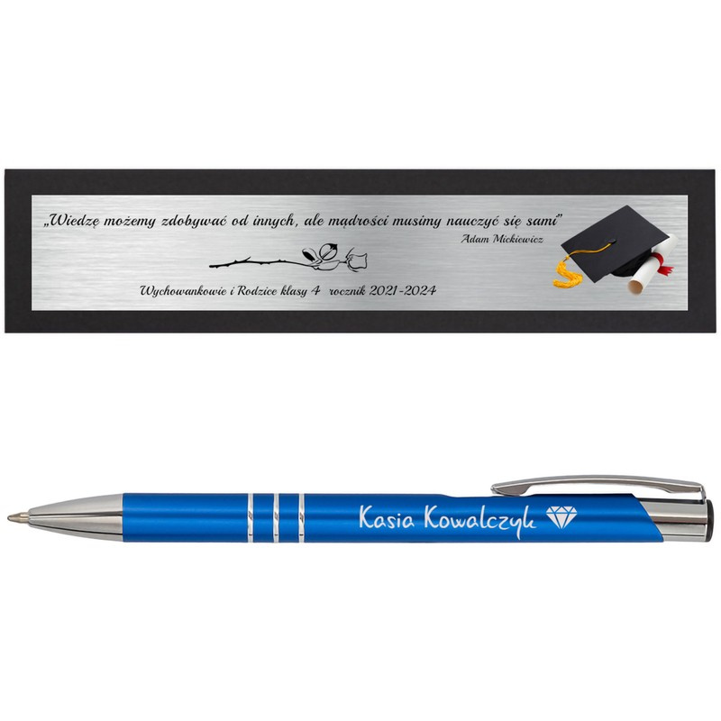 Prezent dla nauczyciela: długopis niebieski z grawerem i logo