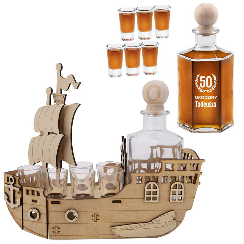 Karafka z grawerem + kieliszki w statku – Personalizowany zestaw prezentowy