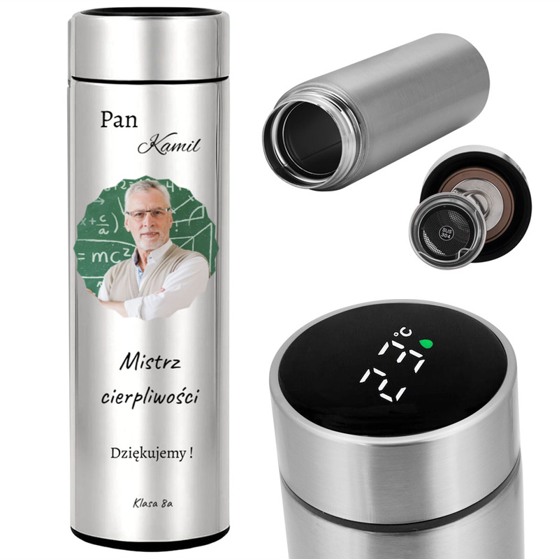 Srebrny kubek termiczny z wyświetlaczem LED – personalizowany trwałym nadrukiem UV dla nauczyciela/ zdjęcie