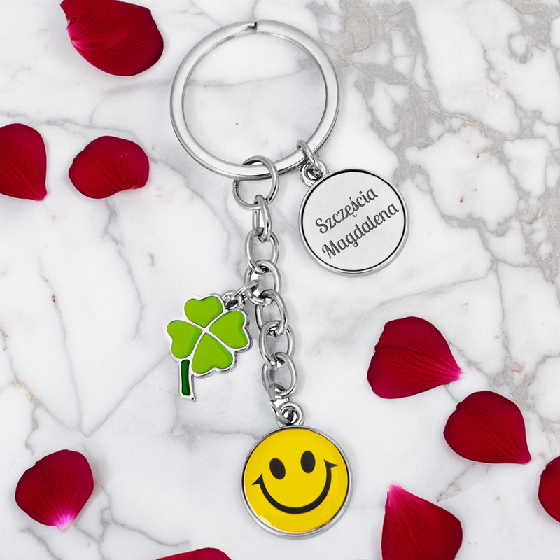 Brelok metalowy z koniczynką i emotikonką / grawer