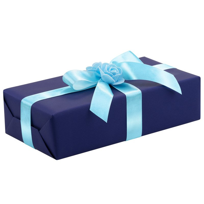 Ręczne pakowanie prezentu - niebieska tasiemka, całość zapakowane w ozdobny papier