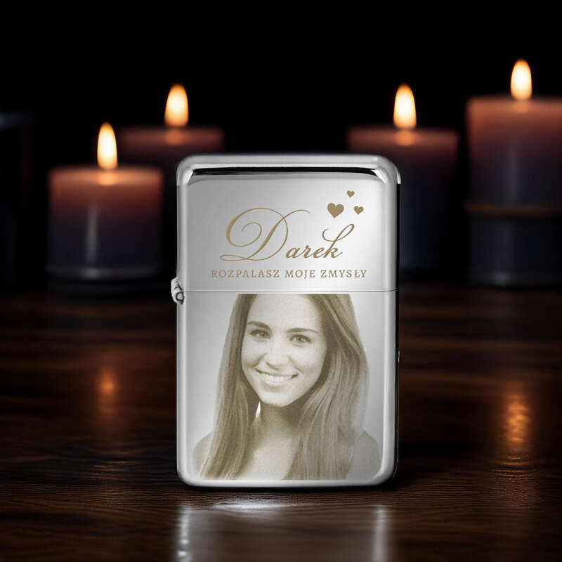 Zapalniczka benzynowa ze zdjęciem TASMAN / Metal Połysk / Rozpalasz moje zmysły / Prezent dla niego na walentynki z Grawerem