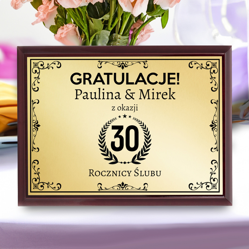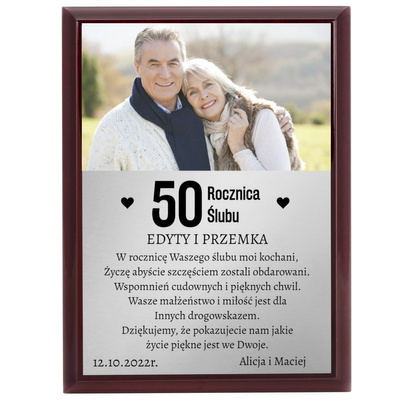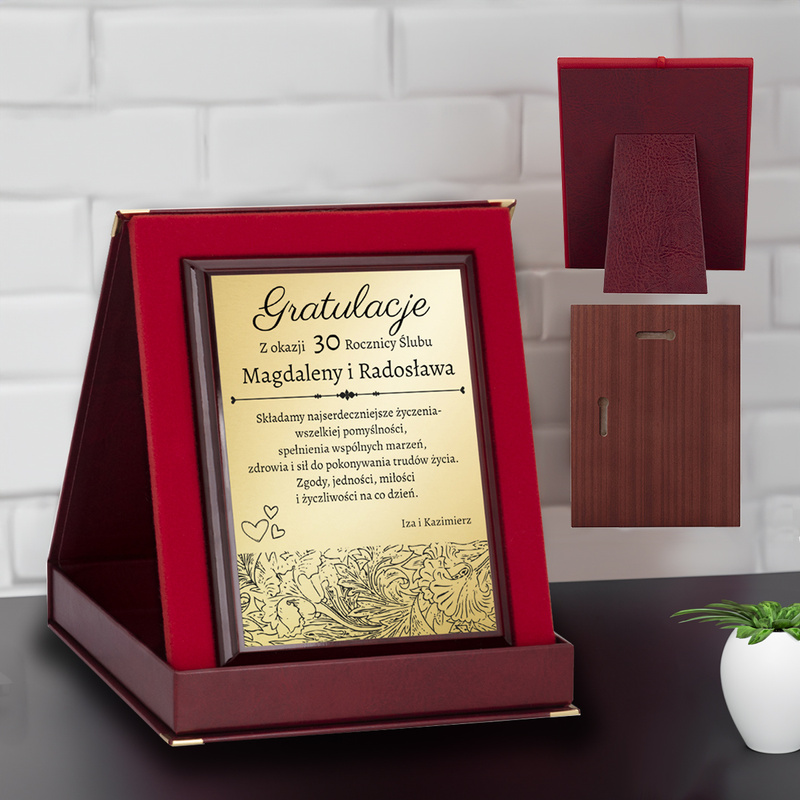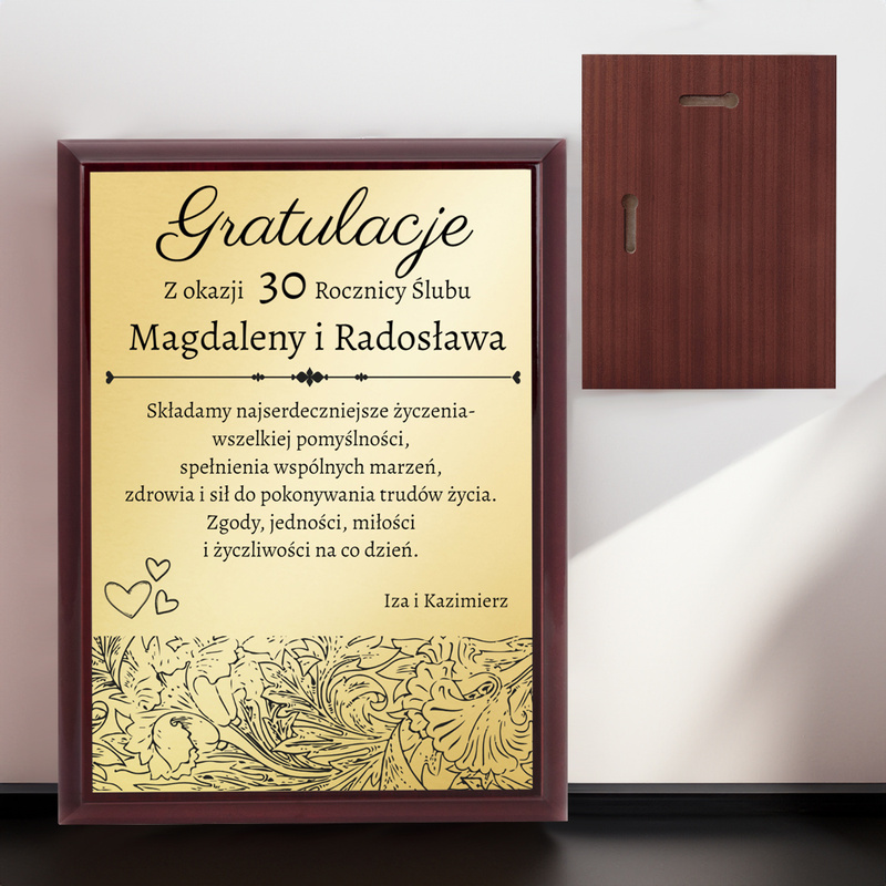 Nasza propozycja to efektowne życzenia złożone z dwóch elementów: drewnianego podkładu przygotowanego do powieszenia oraz aluminiowej tabliczki w kolorze srebrnym. To właśnie na niej umieścimy dowolną dedykację.