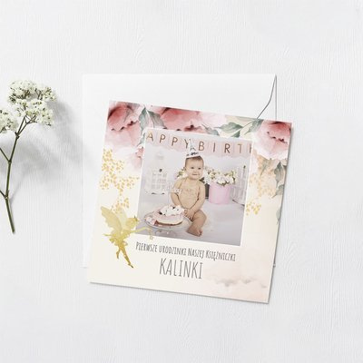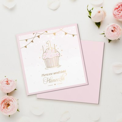 Kartka na roczek zostanie nadrukowana na białym eleganckim papierze, z wybranym przez Państwa motywem. W tym przypadku wzór jest przeznaczony dla dziewczynki, frontowa okładka zostanie ozdobiona babeczką, cała kartka jest w kolorach różu.