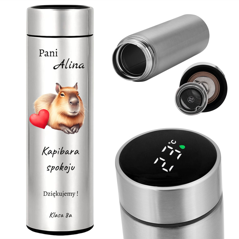 Srebrny kubek termiczny z wyświetlaczem LED – personalizowany trwałym nadrukiem UV dla nauczyciela / zdjęcie