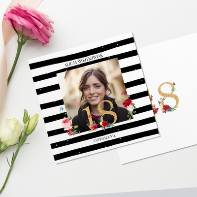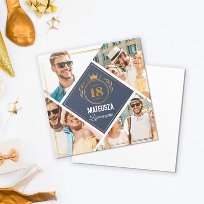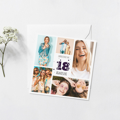 Planujesz imprezę na swoje 18-ste urodziny? Lista gości już gotowa? W takim razie trzeba przygotować zaproszenia i szybko rozdać znajomym. Na naszej stronie znajdziesz specjalnie przygotowane zaproszenia na 18-ste urodziny. Jednym z nich jest prezentowany wyżej projekt. Składa się z kolażu 4 zdjęć. Wybierz te, które najbardziej Cię wyrażają i dodaj treść wewnątrz zaproszenia.